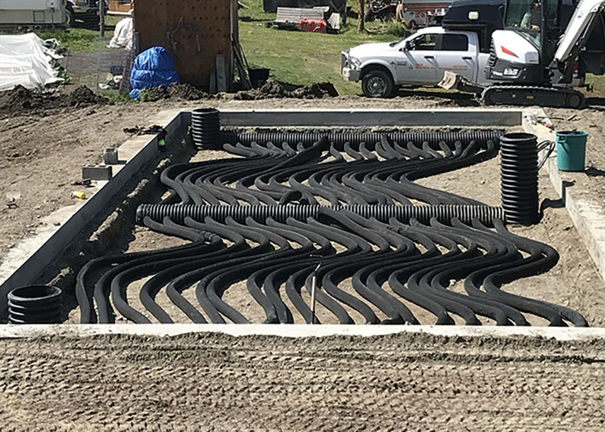 A fan blows hot air (warmed by the sun) from high in the greenhouse through a system of perforated pipes in the soil floor. This helps cool the greenhouse before the hot air needs to be vented outside. The fan also blows relatively cooler air (overnight or on cooler days) through the pipes to warm the air by the heated soil.